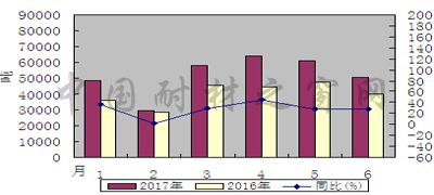 2017年1-6月,我國棕剛玉出口總量約為31.19萬噸,較去年同期增長(zhǎng)29.2%,出口總金額約18546.98萬美元,同比增長(zhǎng)16.1%。其中6月份棕剛玉出口總量約為5.08萬噸,同比增長(zhǎng)28.1%;出口金額約為3019.76萬美元,同比增長(zhǎng)16.1%。